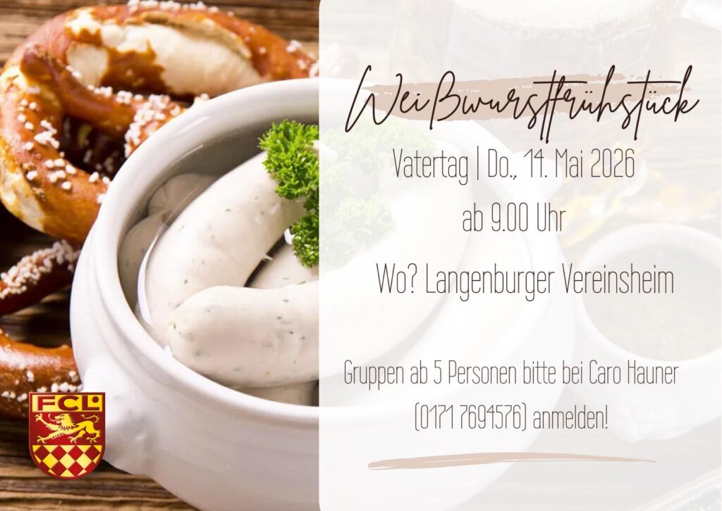 Vorschau *** Weißwurstfrühstück zum Vatertag am 14.05.2026 ab 09.00 Uhr im Vereinsheim *** Anmeldung ab 5 Personen bitte telefonisch unter 0171 – 769 45 76 bei Caro Hauner *** Hinweis Text anklicken um die Vorschau zu öffnen! ×
